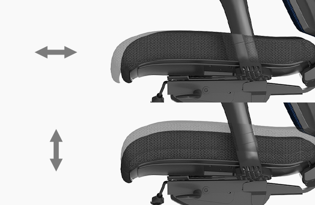 좌판의 측면 레버를 이용하여 사용자의 체형에 맞게 좌판의 깊이와 높이를 조절할 수 있습니다.