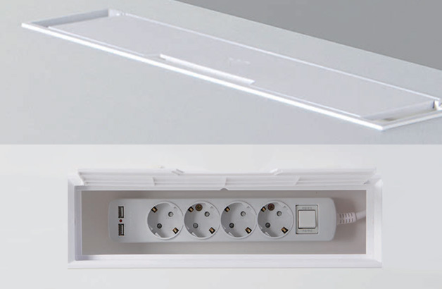 심플한 디자인의 개폐형 덕트 커버를 적용하여 콘센트 사용과 케이블 연결이 편리합니다. 덕트형 데스크의 경우 4구 2USB의 멀티탭이 탑재되어 보다 편리한 사용이 가능합니다.