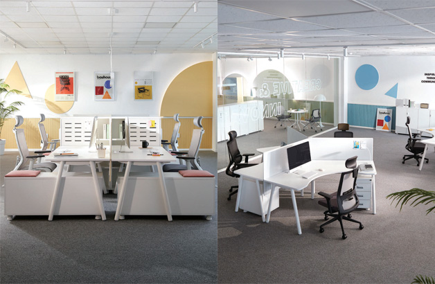일자형 데스크와 120도 데스크를 자유롭게 조합하여 사용자에게 최적의 레이아웃을 구현할 수 있습니다. 일자형 데스크를 사용한 보편적인 사무공간부터 120도 데스크를 활용한 소통 중심의 수평적인 공간까지 창의적인 레이아웃으로 다양한 공간 구성이 가능합니다.