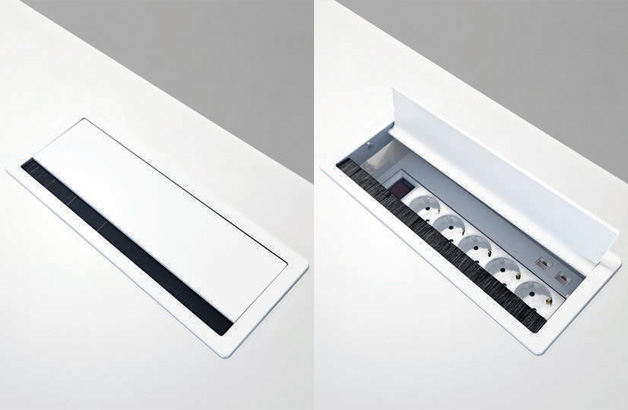 심플한 디자인의 개폐형 덕트커버를 적용하여 콘센트 사용과 케이블 연결이 편리합니다. 덕트형 데스크의 경우 4구 2USB의 멀티탭이 탑재되어 보다 편리한 사용이 가능합니다 .