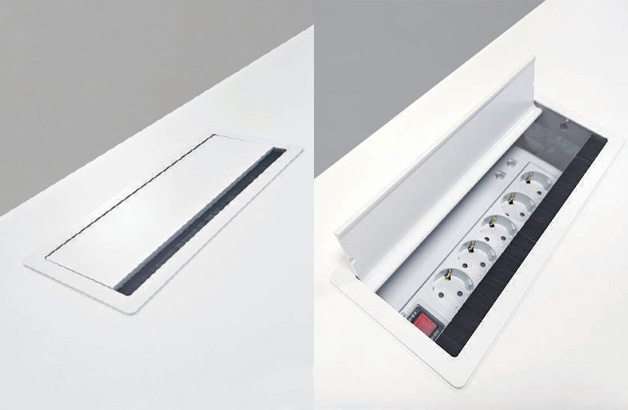 심플한 디자인의 개폐형 덕트커버를 적용하여 콘센트 사용과 케이블 연결이 편리합니다. 덕트형 데스크의 경우 4구 2USB의 멀티탭이 탑재되어 보다 편리한 사용이 가능합니다 .