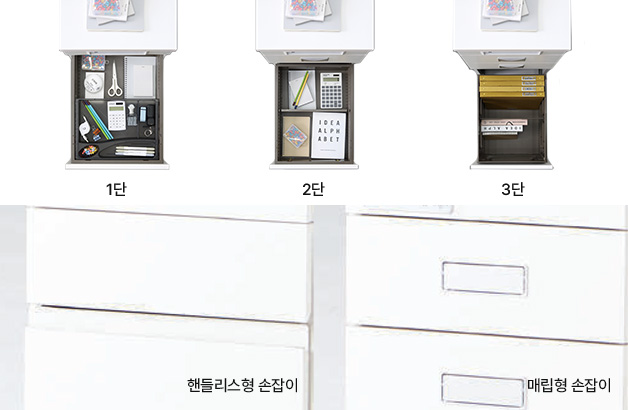 핸들리스형/매립형 손잡이 적용으로 깔끔하고 세련된 디자인을 가지고 있습니다. 각 단별로 다양한 물품을 수납할 수 있습니다. (*2단 이동서랍 - 1단: 필기구 오거나이저/2난:파일 수납 *3단 이동서랍 - 1단 :필기구 오거나이저/2단: 구분 수납/3단: 구분 수납 * 3단 확장형/3단 보조색상형 - 1단: 필기구 오거나이저/2단: 구분 수납/3단: 파일 수납)