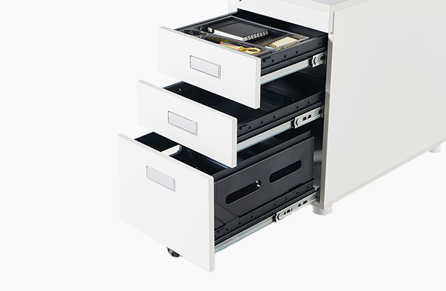 이동형 파일 서랍의 각 단마다 3단 레일을 적용, 폴 익스텐션 기능으로 물품 보관이 편리합니다.