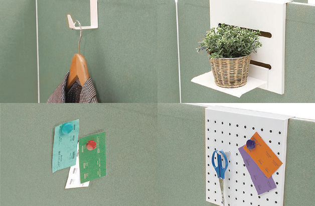 패널에 걸어 사용할 수 있는 다양한 액세서리로 필기구 등 업무에 필요한 물건을 깔끔하게 정리할 수 있습니다. 철판 내장 옵션의 경우, 자석을 부착할 수 있어 메모판으로 활용할 수 있습니다.