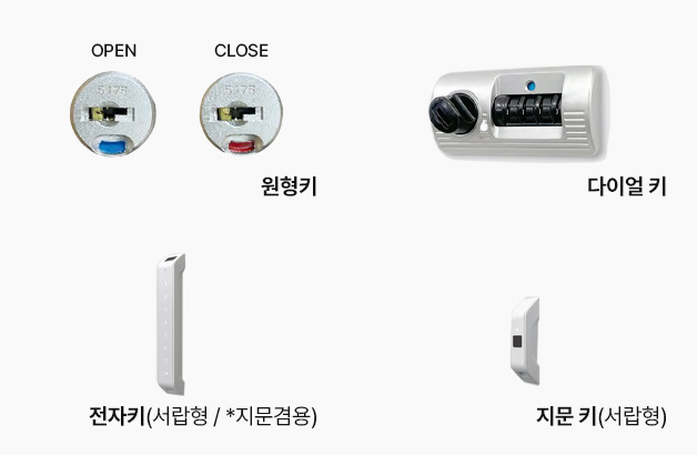옵션: 원형 키, 다이얼 키, 전자 키, 지문 키 / 전자 키: 4~12자리 비밀번호 터치식, 지문 인식 겸용 / 지문 키: 지문 인식 전용 (*공용 사용 시 지문 등록 최대 20명까지 가능)