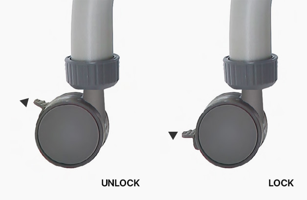 뒷바퀴에 장착된 스토퍼 레버를 내리면 캐스터가 고정되고, 레버를 올리면 캐스터 고정이 풀려 테이블을 이동시킬 수 있습니다.