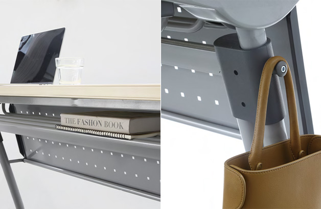 테이블 상판의 하부에 선반이 있어 강의 자료나 필기도구 등을 수납할 수 있으며, 심플하면서도 견고한 가방 걸이가 장착되어 있습니다.