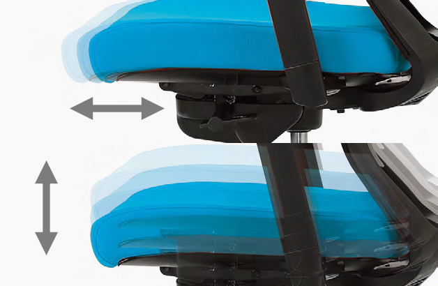 좌판의 측면 레버를 이용하여 사용자의 체형에 맞게 좌판의 깊이와 높이를 조절할 수 있습니다.