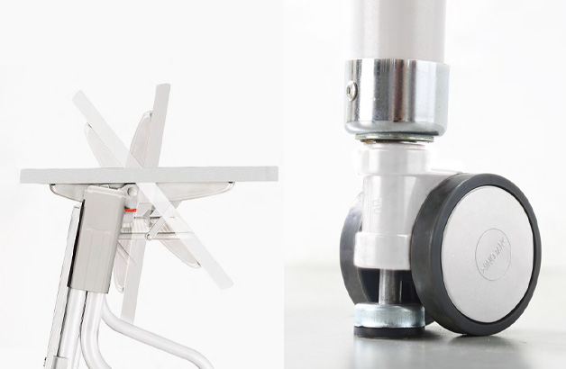 테이블 상판을 아래로 내리면 동시에 스토퍼가 자동으로 올라가 이동할 수 있고, 상판을 올리면 동시에 스토퍼가 자동으로 내려와 움직이지 않게 고정됩니다.